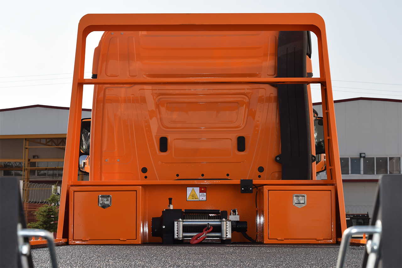 Negatif etkili diskli hidrolik fren sistemi, basınç kaybı durumlarında dahi yükü %100 güvenle sabitleyerek maksimum güvenlik sağlar. Bu özellik, özellikle yüksek tonajlı yüklerin taşınması ve kurtarma operasyonlarında kritik bir avantaj sunar. Standart manuel halat boşaltma sistemi, operatöre sahada hızlı ve pratik müdahale imkânı sunar. Opsiyonel pnömatik boşaltma kolu ile kullanım kolaylığı artırılabilir. Ön makara ve halat baskı makarası, halatın düzgün ilerlemesini sağlayarak operasyon sırasında oluşabilecek riskleri minimize eder.
