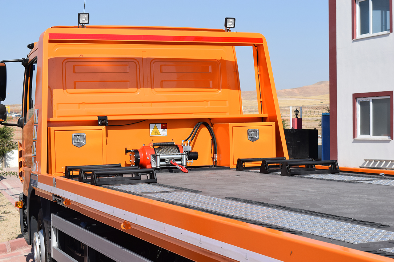Negatif etkili disk fren sistemi, basınç kaybı durumlarında dahi yükü %100 sabitleyerek maksimum güvenlik sağlar. Bu özellik, özellikle kurtarma vinci ve çekme vinci uygulamalarında kritik bir avantaj sunar. Hidrolik vinç sisteminin sunduğu hassas kontrol kabiliyeti sayesinde yük hareketleri güvenli, dengeli ve kontrollü şekilde yönetilebilir. Standart olarak sunulan manuel halat boşaltma sistemi, sahada hızlı müdahale imkânı sunarken opsiyonel pnömatik boşaltma kolu ile kullanım daha pratik hale getirilebilir. Ön makara ve halat baskı makarası, halatın düzgün ilerlemesini sağlayarak operasyon sırasında oluşabilecek riskleri minimize eder.