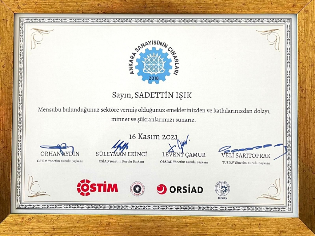 "Sanayinin Ustalarına Vefa Ödülleri" töreninde, firmamız yönetim kurulu başkanı Sadettin Işık’a takdim edilen vefa ödülü için bu güzel organizasyonu düzenleyen “OSTİM OSB”, ”TÜSİAV”, ”ORSİAD” ve “OSİAD” a teşekkür eder, saygılarımızı sunarız.